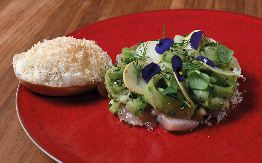 Truite marinée, salade de concombre et ciabatta